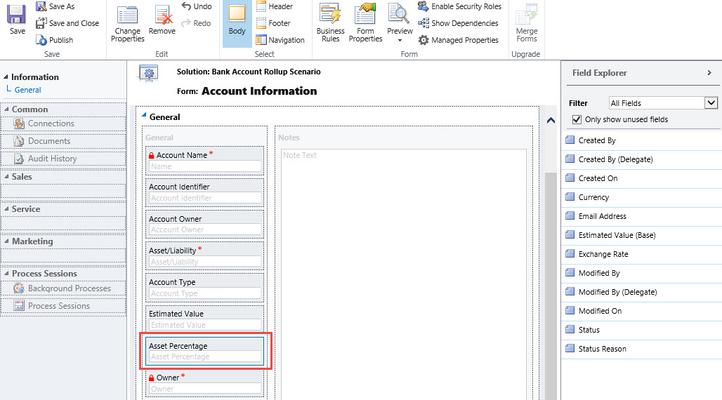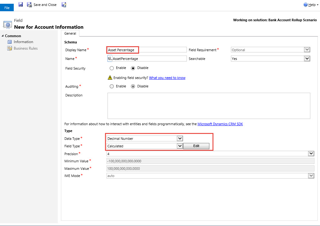 Click on the edit button, As you can see I am using the Estimated Value attribute as the nominator and the Total Asset Rollup field at the contact parent level as the denominator. So the formula is as follows AccountInformation.sjj_estimatedvalue / Contact.sjj_networth.