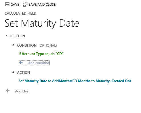 Formula Information: Notice in the formula above we are creating an initial calculation option that will AddMonths, (We are using the Maturity in Months attribute as the plug. We are going to increment the Createon date, (Our assumption is the CD will be tracked starting on the date the record is created).
