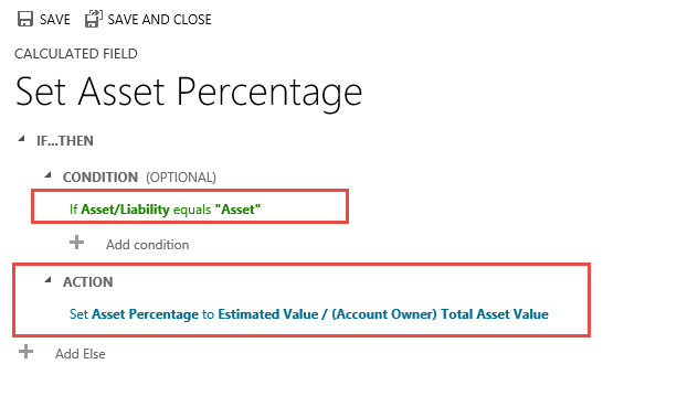 Our next step is to create a condition where the calculation will only render if the Account Information record is defined as an “Asset” Record.