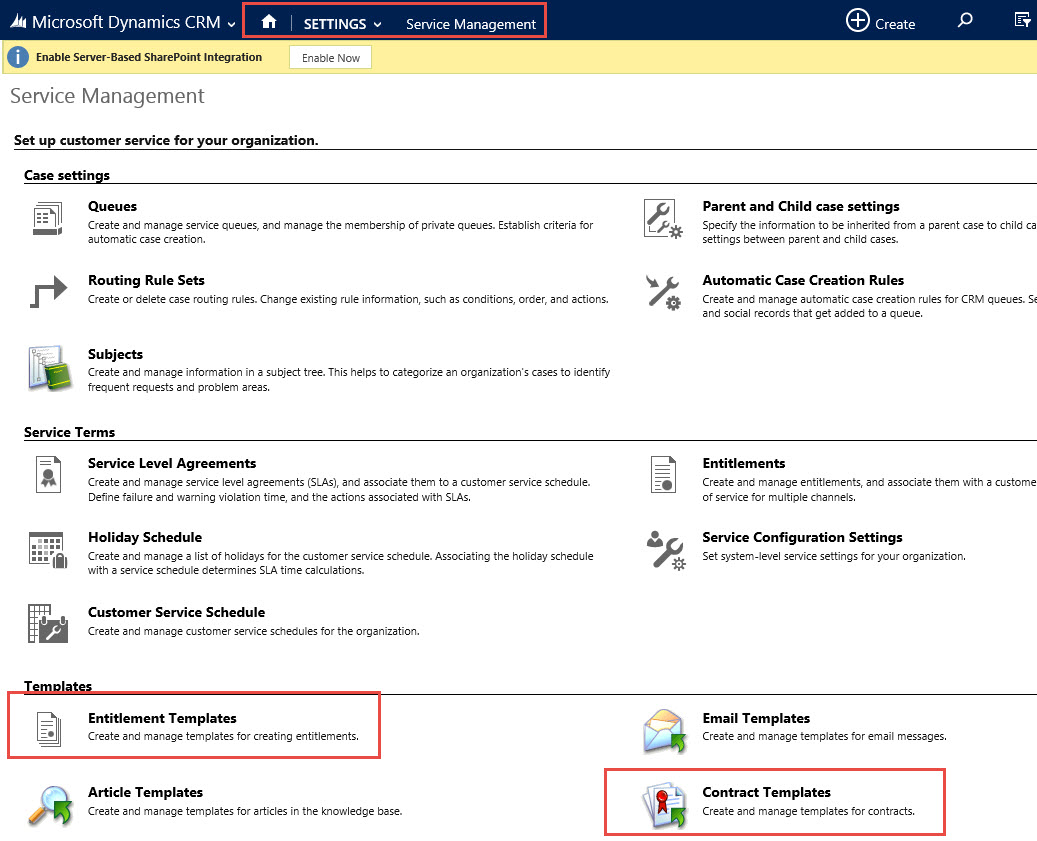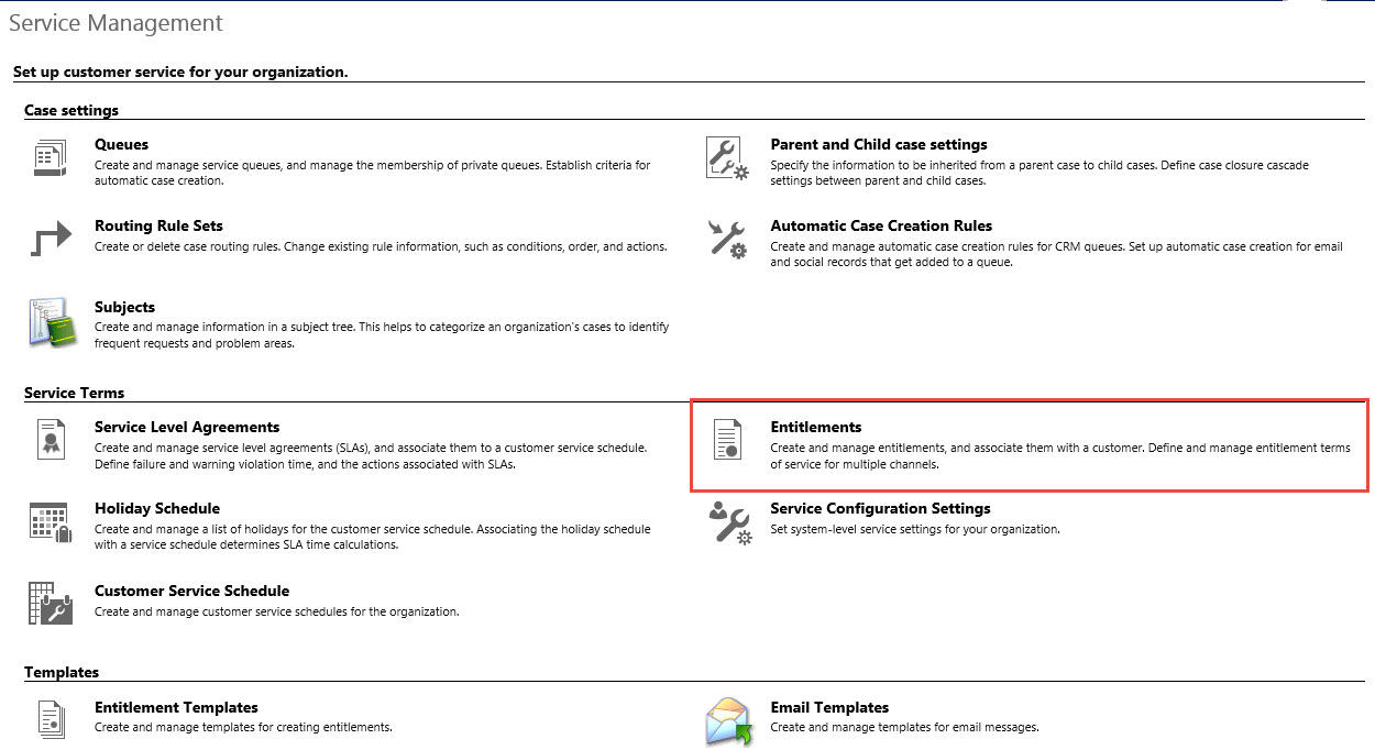 In conclusion, Entitlements can be deployed in lieu of Contracts starting in the spring release of CRM 2013 and CRM 2015 first release. One last challenge I wanted to mention, the Entitlement Templates are still not assessable under the Settings -> Template Tile, you can only access under the Settings -> Service Management Tile under Entitlement Templates.
