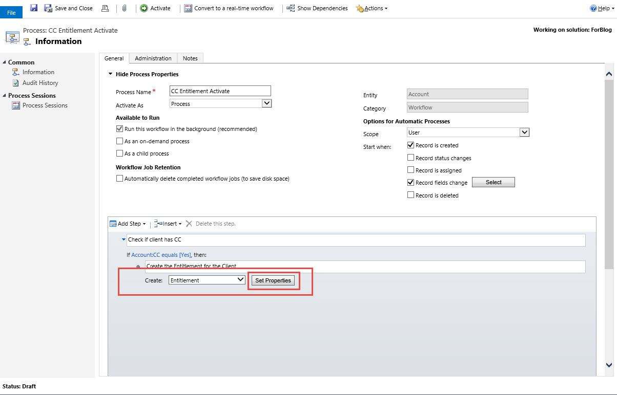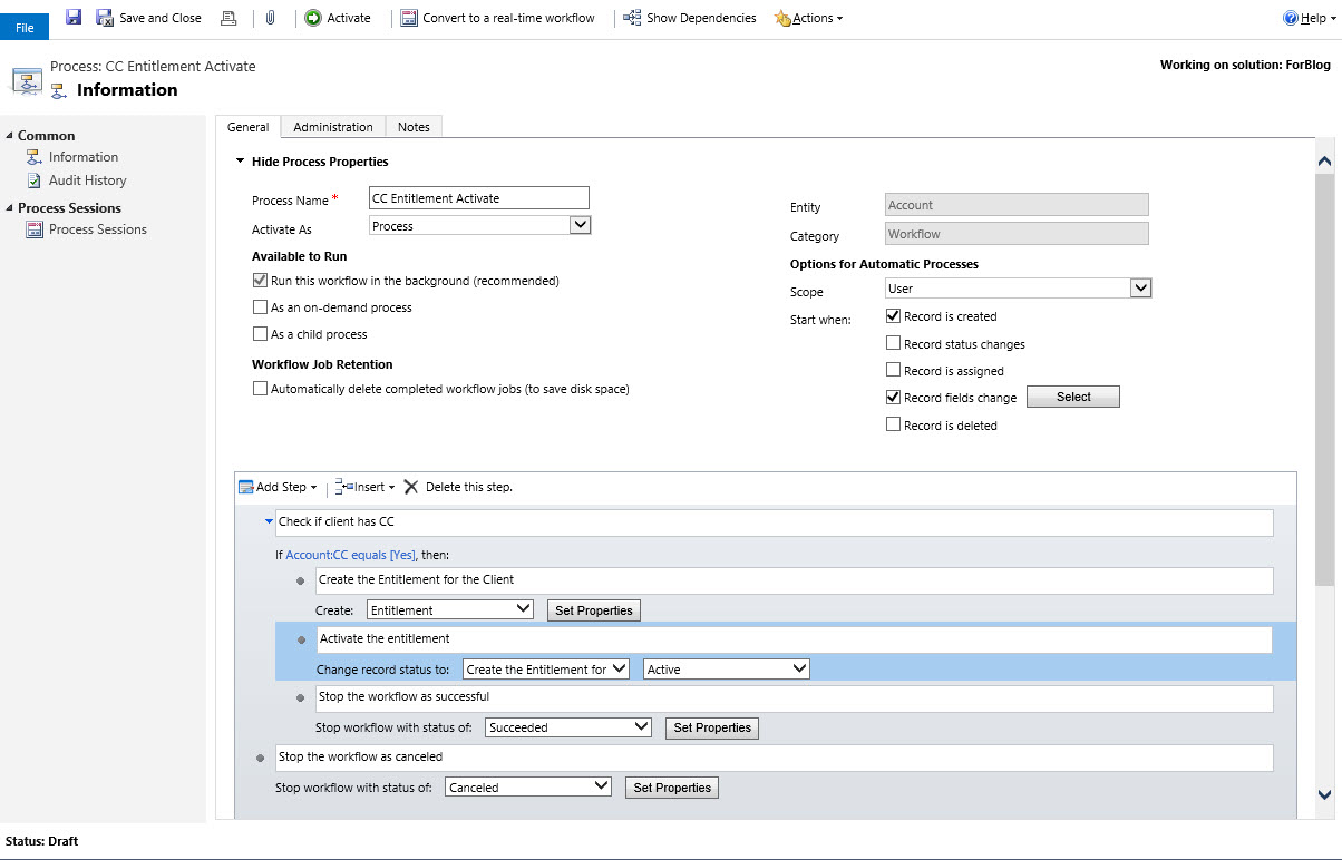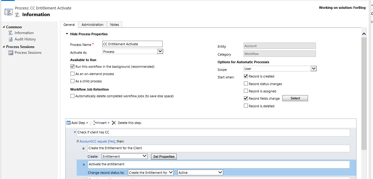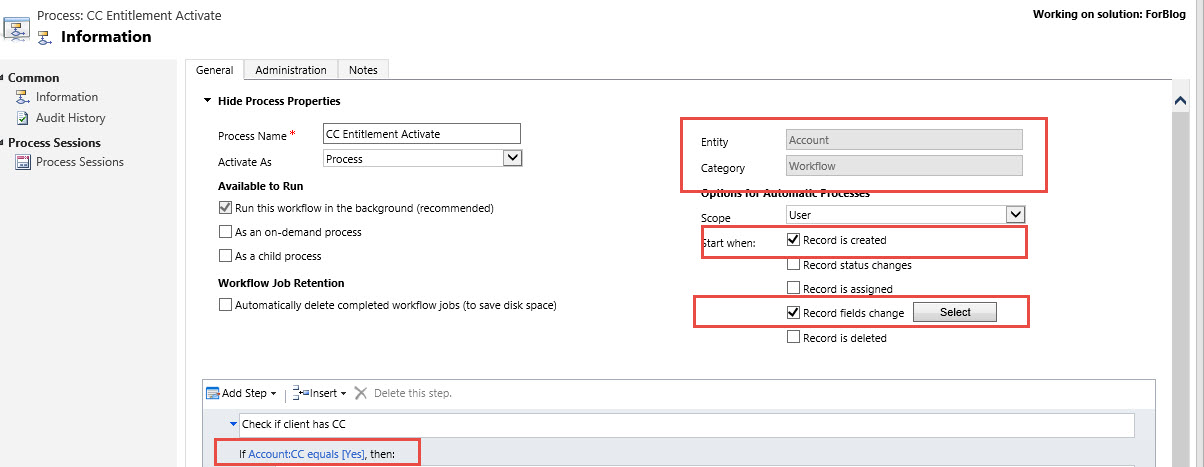 First step is trigger of the CC attribute we created when the option is set to YES. We can do this two ways both on Create of the client record and also on the modification of the CC attribute. We will then set the condition to instantiate if the CC is = “YES”