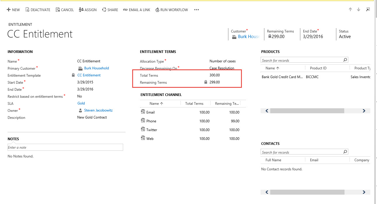 Our Bank Fraud Department wants to use Microsoft CRM 2015 for case management. They want to start by tracking client reported customer cases with respect to bank issued credit cards. The bank issues credit cards to customers and would like to attach a yearly entitlement sufficient to address any issues their client’s might have with respect to their card. They would like to use entitlements to track all issues related to the customer owned credit cards.