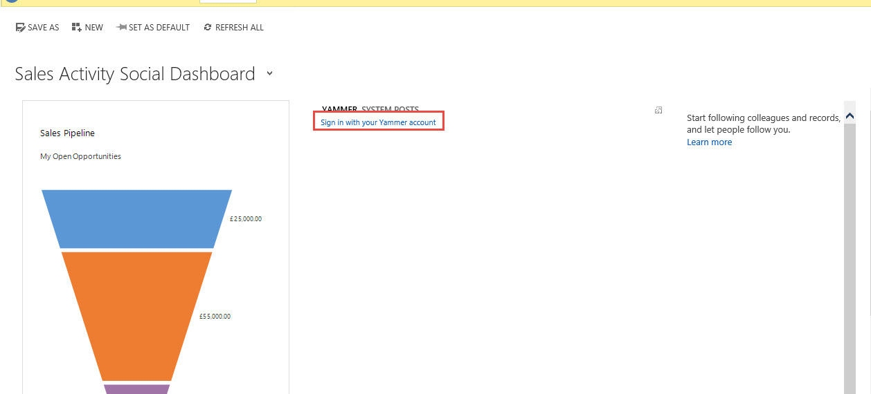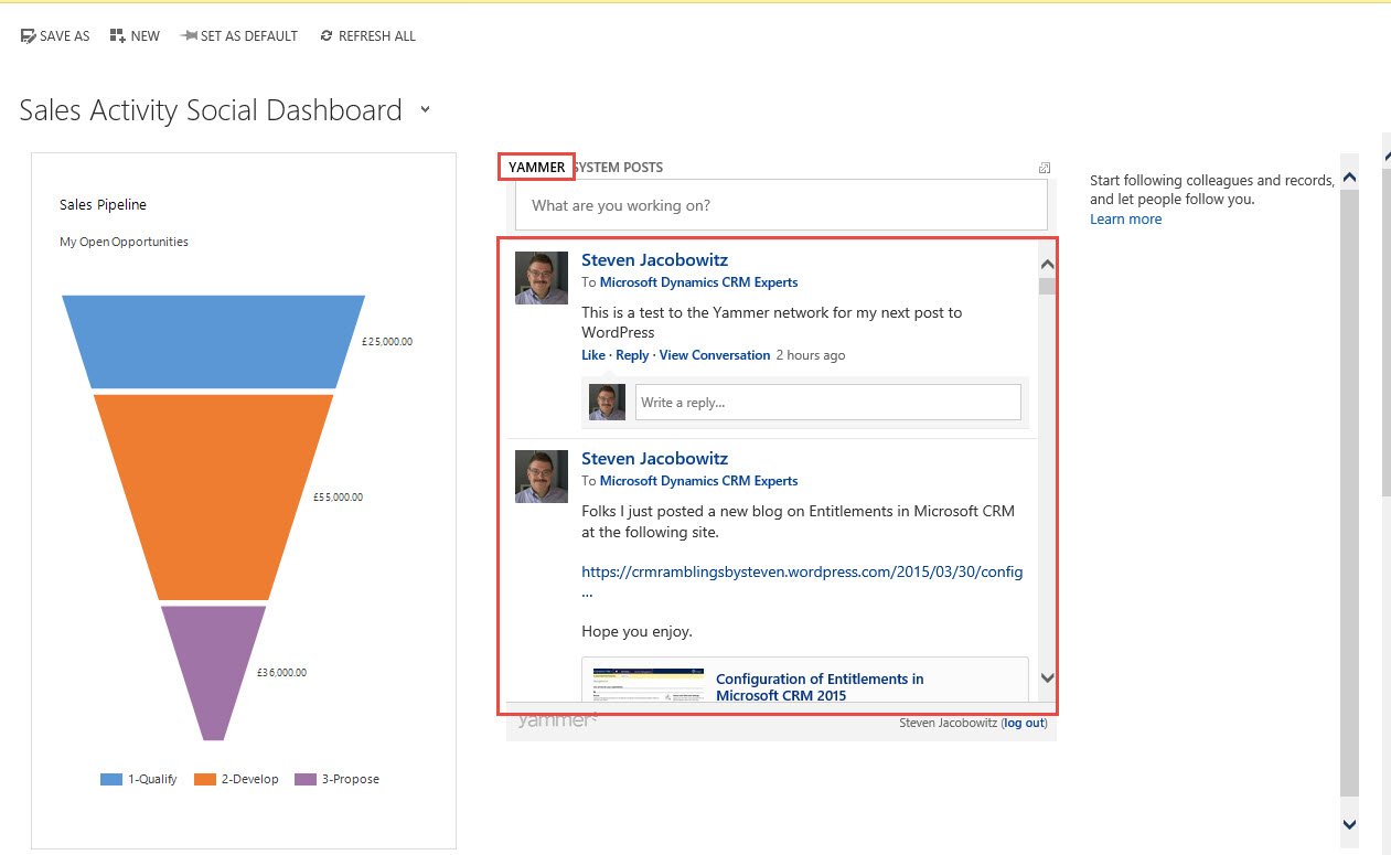 Navigate back to the Sales Activity Social Dashboard and click on the Yammer option, notice you are now viewing yammer posts.