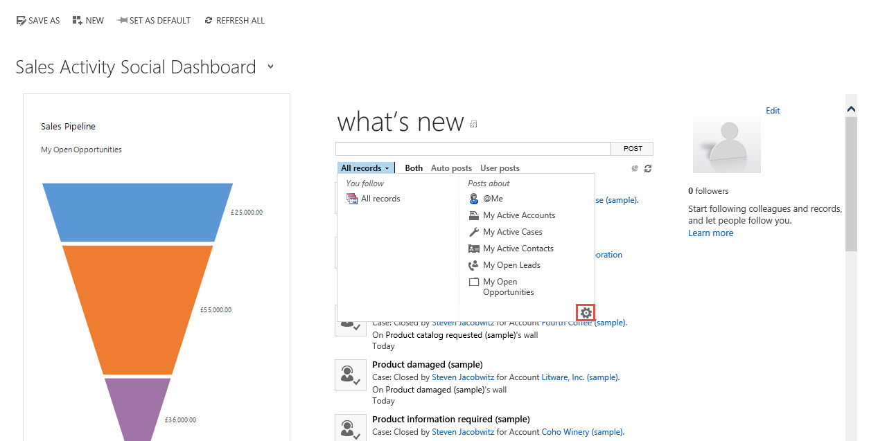 Progressively, the functionality has been enhanced from the original solution set. Any record you own will automatically post to the what’s new section of the Activity Social Dashboard. You can also follow records you do not own in order to view any updates made by others collaborating or working on these records.
