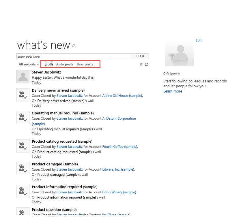 You also have the ability to filter the posts in what’s new by auto posts, (posts that are written to the database because of changes in records you are following or own a record),